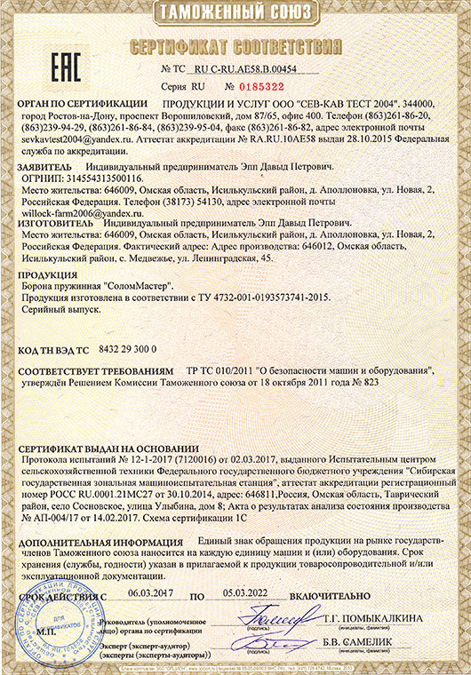 CERTIFICATE ISSUED ON THE BASIS OF test report No. 12-1-2017 (7120016) dated 02.03.2017 issued by the Test Center of Agricultural Machinery of the Federal State Budgetary Institution "Siberian State Zonal Machine Testing Station", accreditation certificate registration number ROSS RU.0001.21MS27 dated 30.10.2014, address: 8, Ulybina St., Sosnovskoe Selo, Tavrichesky District, Omsk Region, Russia 646811; Act on the results of the analysis on the state of production No. AP-004/17 dated February 14, 2017. IC Certification Scheme